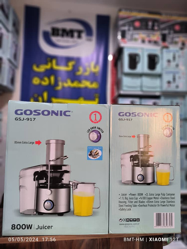 آبمیوه گیری گاسونیک مدل GSJ-917 با ظاهری ساده و زیبا و با قدرت موتور 800 وات، دستگاهی تک کاره برای مصارف خانگی طراحی و تولید شده است و آبگیری انواع میوه را با کمترین زحمت و صرف زمان کم امکانپذیر می سازد. بدنه اصلی دستگاه از جنس استیل ضد زنگ و پلاستیک بوده و بر روی آن ولوم چرخشی جهت روشن و خاموش، سرعت کم و زیاد طراحی شده است . همچنین در زیر آبمیوه گیر، پایه های ضد لغزش تعبیه شده که از لرزش و سرخوردن آن هنگام کار جلوگیری می نماید. لازم به توضیح است، فیلتر آبمیوه گیری 917 گاسونیک از جنس استیل ضد زنگ مرغوب نیزمی باشد. این دستگاه به دلیل داشتن قطر زیاد دهانه ورودی، امکان آب گیری انواع میوه ها و سبزیجات را بدون برش یا با حداقل برش فراهم می کند و نوشیدن آبمیوه ای گوارا همراه با حفط خواص میوه ها را به فراهم می آورد.همچنین پارچ پلاستیکی با ظرفیت 1.1 لیتر با سرپوش در زیر خروجی آبمیوه گیری GSJ 917 Gosonic قرار می گیرد. گاسونیک ( Gosonic ) شرکت ترکیه ای معروف و شناخته شده در زمینه تولید لوازم خانگی است که بسیاری از محصولات خود را با مشارکت کشور چین عرضه می نماید و با تولید محصولات متنوع، با کیفیت و مقرون به صرفه توانسته جایگاه خوبی را در میان برندهای مطرح جهانی بدست آورد.