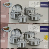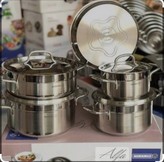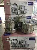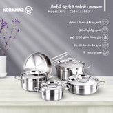 یک قابلمه سایز ۲۴ به همراه در استیل یک قابلمه سایز ۲۰ به همراه در استیل یک قابلمه سایز ۱۶ به همراه در استیل یک تابه گرد دو دسته سایز ۲۴ به همراه در استیل یک تابه گرد تک دسته سایز ۲۴ بدون در