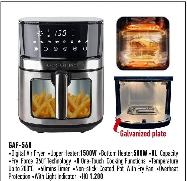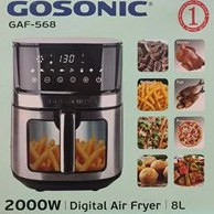 یکی از سرخکن های بدون روغن، سرخ کن گوسونیک دو المنته ۸ لیتر مدل GAF-568 است که دارای توان ۲۰۰۰ وات است و همین موجب میشود بتوانید هر نوع خوراکی را به کمک آن سرخ کنید. این توان بالا به کمک ۲ المنت ایجاد میشود که ۱۵۰۰ وات آن در المنت بالا و ۵۰۰ وات در المنت پایین ایجاد شده است. ظرفیت 4.5 لیتری این دستگاه برای خانواده های متوسط و کم جمعیت مناسب است. 8 برنامه از پیش تعیین شده این سرخ کن را محصولی پرطرفدار کرده است که بدون کمترین مشکلی بتوانید مواد غذایی مورد نیازتان را بدون کمترین روغن ممکن سرخ کنید.