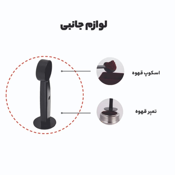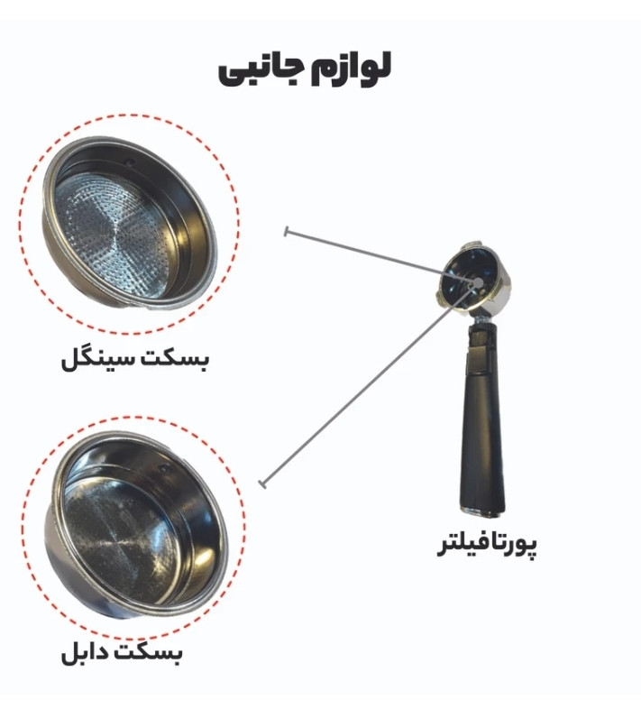 تامپر پودر قهوه (فشاری), یک عدد پرتافیلتر, یک عدد سبد پرتافیلتر تک شات, یک عدد سبد پرتافیلتر دو شات