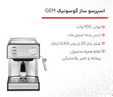 پمپ بخار ساخت شرکت ULKA ایتالیا با فشار بخار بالا ۲۰ بار، مخزن آب جداشو با گنجایش ۱.۶ لیتر، توان مصرفی ۹۵۰ وات، استیمر بخار جهت تهیه فوم کاپوچینو و قهوه لاته و همچنین برای تهیه قهوه ترک نیز قابل استفاده میباشد، دارای گرم کن فنجان در قسمت بالای دستگاه، دارای پیمانه و تمپر پلاستیکی، دارای یک عدد صافی دبل شات دوجداره، دارای فشار سنج