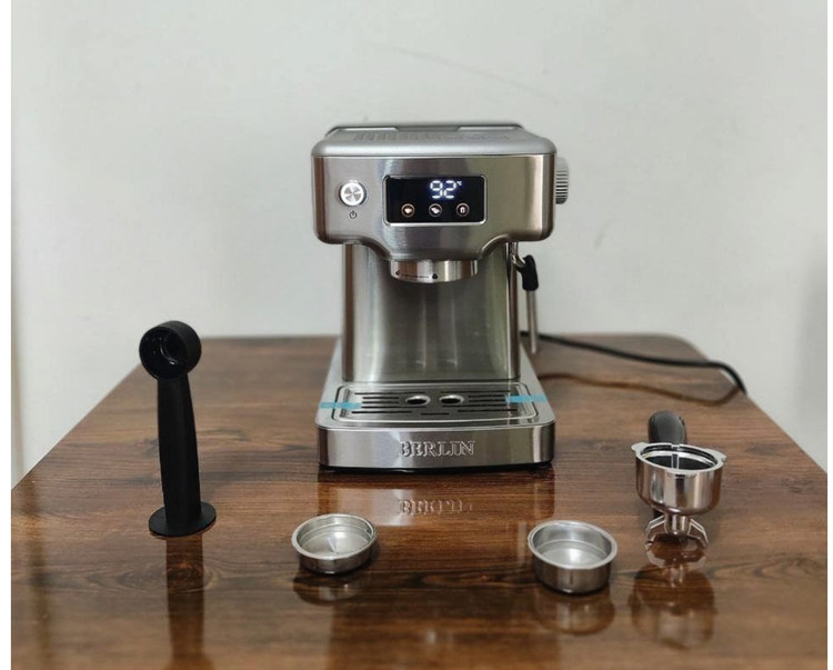 اسپرسو ساز حرفه ای برلین، توان مصرفی ۱۳۵۰ وات، پمپ بخار حرفه ای ساخت شرکت ULKA با فشار بخار بالا ۲۰ بار، مخزن آب جداشو با گنجایش ۱.۸ لیتر، بدنه ساخته شده از آلومینیوم و استیل، صفحه نمایش LCD لمسی، استیمر بخار حرفه ای جهت تهیه کف شیر کاپوچینو و لاته و همچنین برای قهوه ترک نیز قابل استفاده میباشد، صفحه گرم کن فنجان، صافی دبل شات تحت فشار(دو جداره)، دارای پیمانه و تمپر پلاستیکی، لازم به ذکر است دستگاه دارای پمپ حرفه ای ساخت کشور آلمان میباشد و برای افرادی که قهوه اسپرسو حرفه ای میخواهند بسیار مناسب و برای مصارف زیاد نیز قابل استفاده میباشد، طراحی و مهندسی در کشور آلمان مونتاژ نهایی در کشور چین