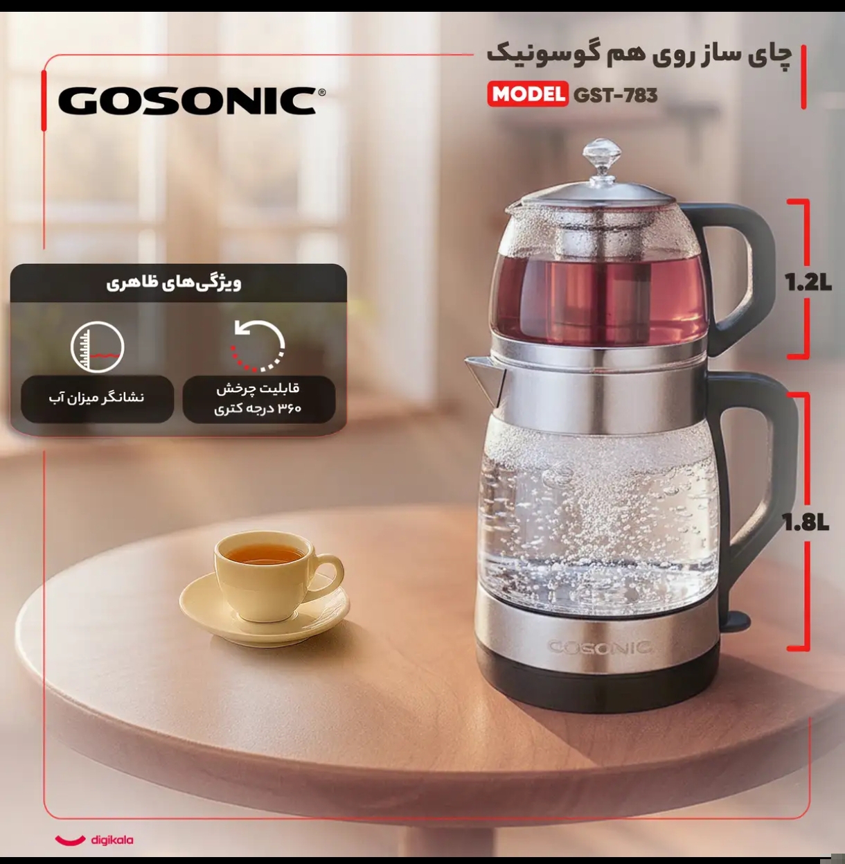 توان مصرفی ۲۲۰۰ وات، گنجایش کتری ۱.۸ لیتر، گنجایش کتری ۱.۸ لیتر، گنجایش قوری ۱.۲ لیتر، سیستم گرم نگه دارنده، چرخش ۳۶۰ درجه کتری بر روی پایه، دارای لامپ ال ای دی آب، صافی قوری تمام استیل، دارای درب مجزا کتری
